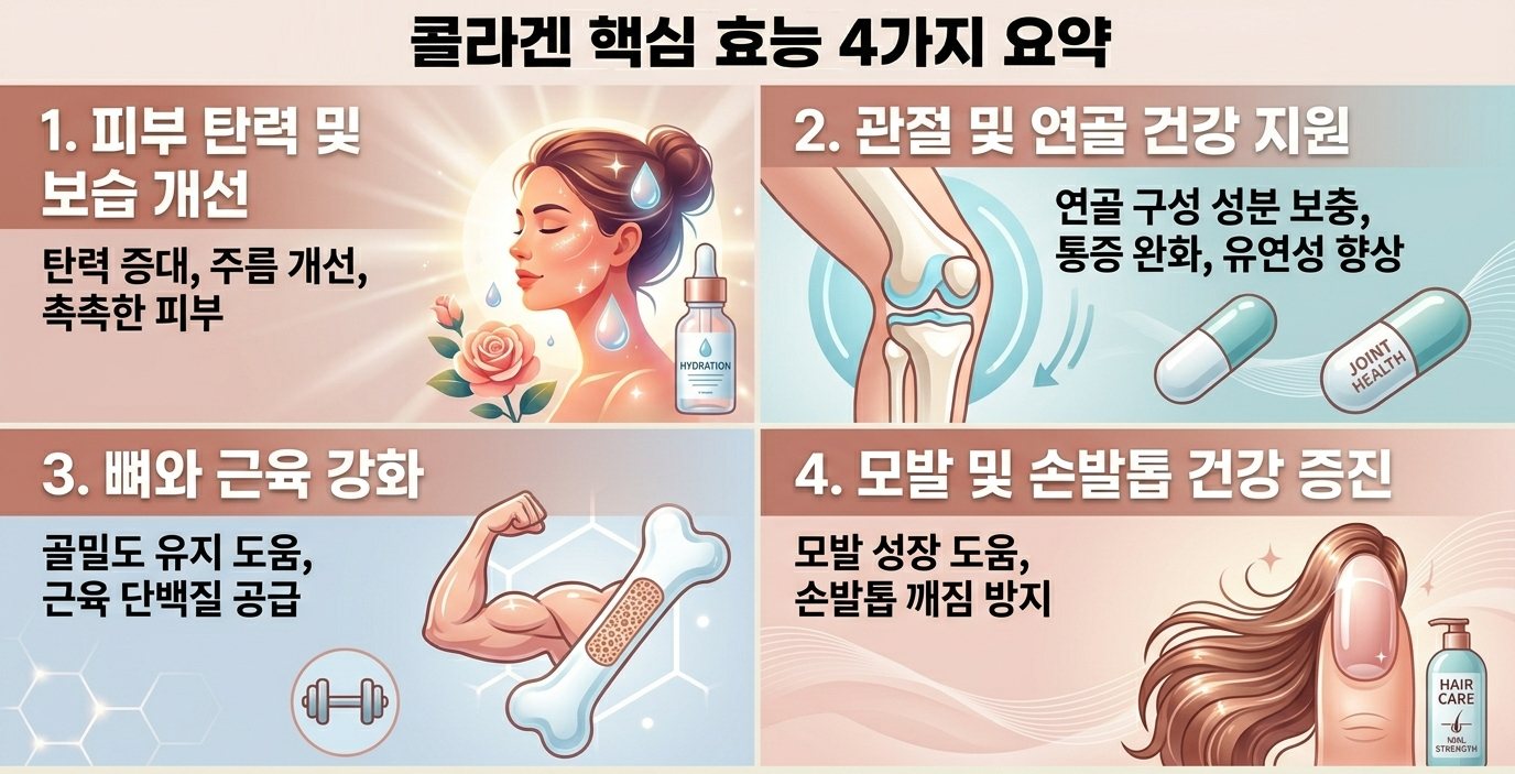 피부 탄력 및 보습 개선: 가장 대표적인 효능이죠! 콜라겐은 피부 속 수분을 잡아주고 세포 사이의 결합을 단단하게 만들어 주름 개선과 탄력 유지에 도움을 줘요.