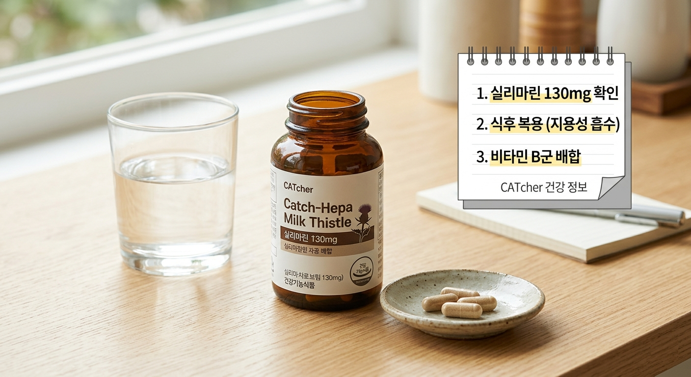 실리마린은 지용성(기름에 녹는 성질) 성향이 있어 식사 직후에 드시는 것이 가장 좋아요. 음식물 속의 지방 성분이 흡수를 도와주기 때문이죠. 또한, 위장이 예민한 분들은 공복에 드시면 속 쓰림을 느낄 수 있으니 식후 복용을 권장해요.