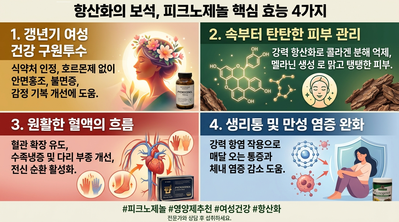 단순히 소문만 좋은 게 아니에요. 수많은 임상 연구를 통해 밝혀진 피크노제놀의 핵심 효능 4가지를 살펴볼까요?